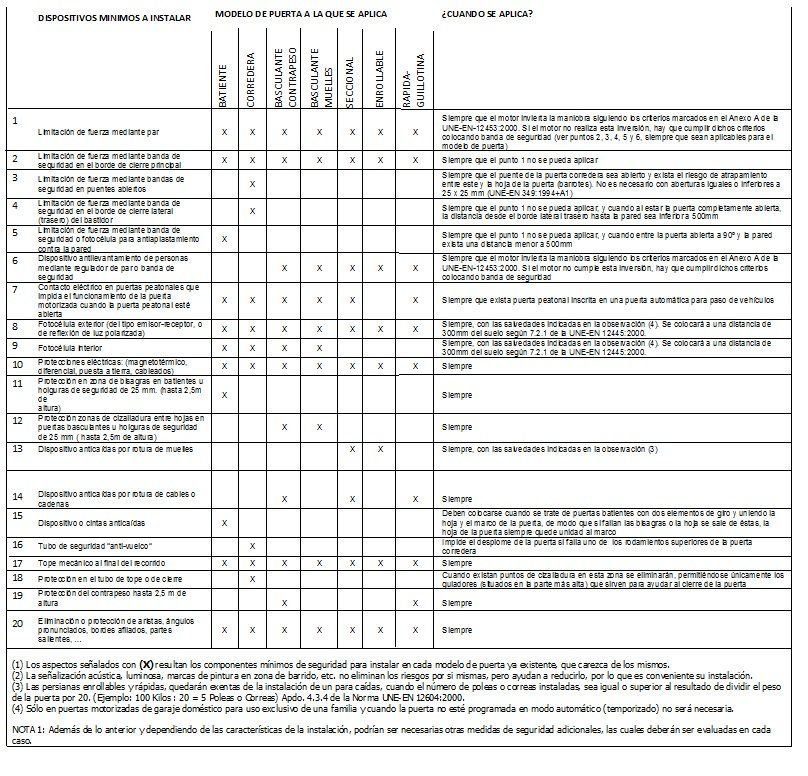 En dicha Norma se detallan las medidas mínimas de seguridad que deben cumplir las puertas automáticas, en función de su tipo (batiente, basculante, corredera, …) y del tipo de usuario (particular, pública concurrencia, personal adiestrado, …)